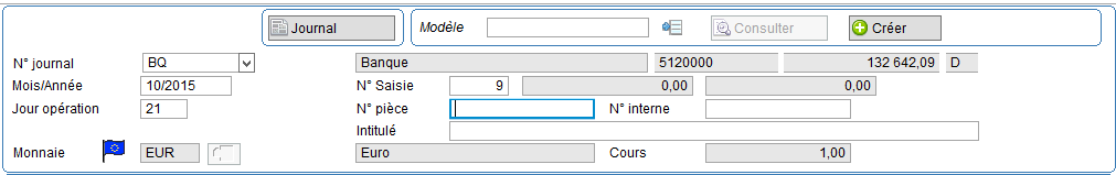 Dès que vous choisissez un journal de trésorerie dans la zone de saisie Journal, le numéro de compte de trésorerie associé au journal apparaît ainsi que son solde. L'indication de la lettre C ou D vous indique s'il s'agit d'un solde au Débit ou au Crédit.