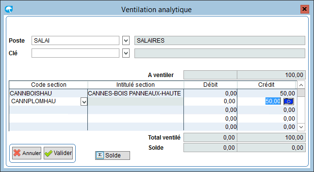 · Gestion de l'analytique (en option) : En phase de saisie d'écritures, pour tout compte défini comme supportant l'analytique (selon la nomenclature des comptes), une fenêtre de saisie des ventilations analytiques apparaîtra.
