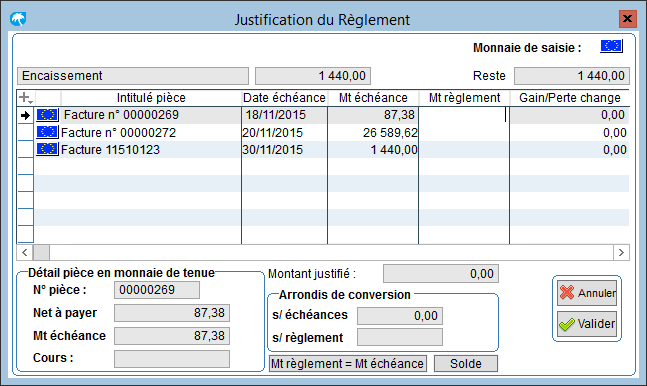 · Justification des règlements : En phase de saisie d'écritures, pour tout journal de trésorerie, d'effets à payer ou à recevoir, une fenêtre de saisie des justifications d'échéances apparaîtra.