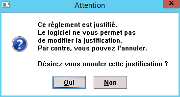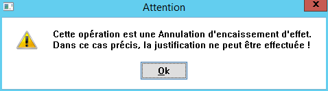 Lorsque vous saisissez la ligne d'écriture correspondant au compte d'effet à recevoir annulé, un message vous informe qu'il s'agit d'une annulation d'encaissement et qu'aucune justification n'est possible.