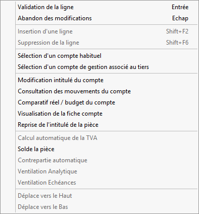 Dans une pièce comptable comportant plusieurs lignes d'écritures, vous pouvez déplacer les lignes d'écritures pour les classer dans l'ordre que vous souhaitez. Pour déplacer une ligne vers le haut, positionnez-vous sur la ligne puis appelez le menu contextuel par un clic souris droit et choisissez l'option "Déplace vers le haut".