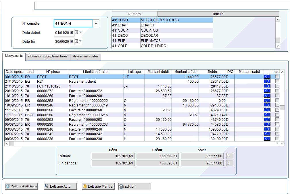 Par ce même menu contextuel, en sélectionnant "Consultation des mouvements du compte" dans le menu contextuel, vous accédez directement aux fonctionnalités de consultation des comptes et de ses masses mensuelles ainsi qu'aux fonctionnalités de lettrage. En effet, l'écran suivant apparaît :
