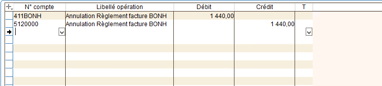 Saisissez votre écriture d'annulation de règlement, comme le montre les lignes suivantes :