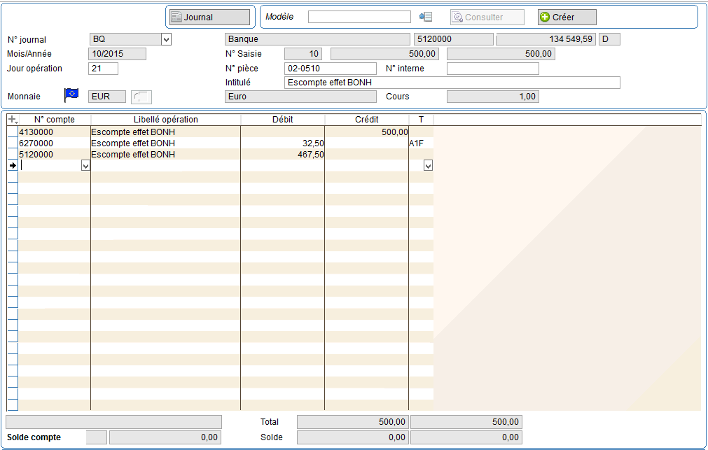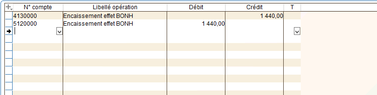 Dans le cas où l'effet est escompté, vous devrez saisir une écriture supplémentaire relative à l'escompte dans le journal de trésorerie.