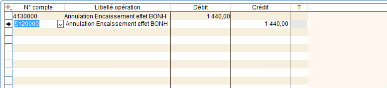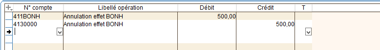 û Annulation de l'effet : Une fois l'escompte annulé, vous devez annuler l'effet afin que votre client apparaisse à nouveau comme devant une facture. Selon le principe adopté jusqu'ici, l'effet doit être annulé dans le journal d'effets.