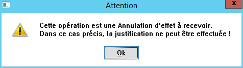 A la saisie du compte de tiers, un message vous indique alors qu'il s'agit d'une annulation d'effet et, par conséquent, la justification ne peut avoir lieu.