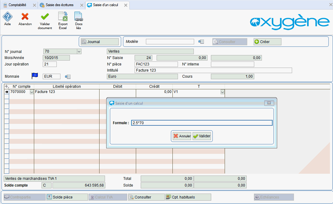 Lorsque vous êtres sur la colonne Débit ou Crédit, la saisie au clavier du caractère "C" (minuscule ou majuscule) permet d'ouvrir un écran de calcul, dans lequel vous pouvez saisir une formule de calcul. Vous souhaitez par exemple effectuer le calcul suivant : 2.5 x 70