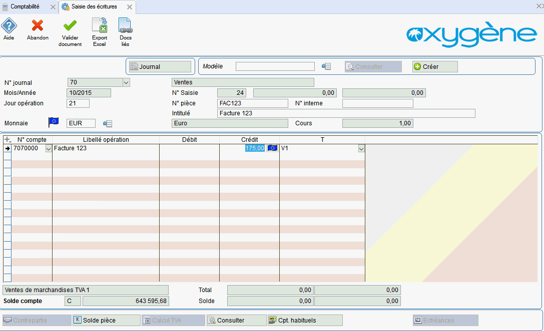 En grisé, vous visualisez le total Débit et le total Crédit de votre pièce ainsi que le solde de la pièce au fur et à mesure de votre saisie. Validez votre saisie.