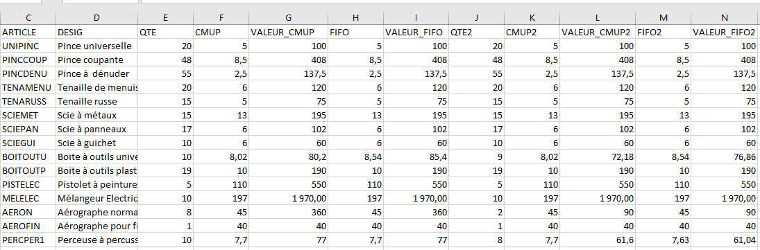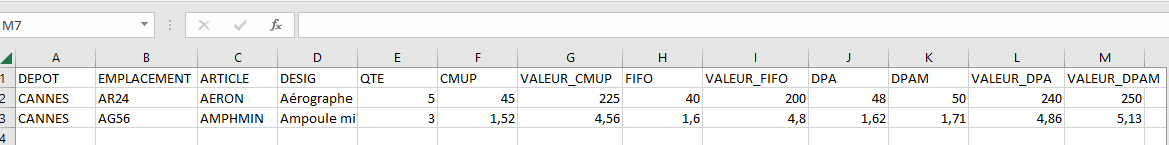 - Depuis la version oxygène 11.01 on exporte également la valeur du stock au FIFO et le FIFO unitaire aux 2 dates choisies (colonnes H et I, et M et N)
