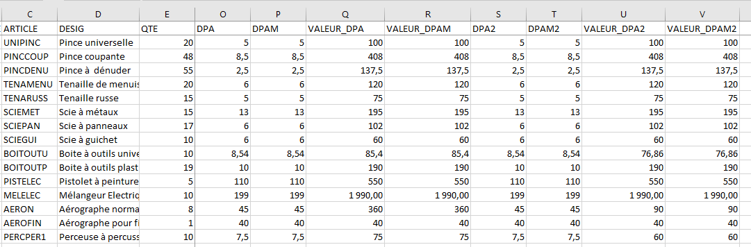 - Si option cochée des DPA : DPA et valeur stock au DPA, et DPA majoré et valeur stock au DPA majoré, soit 4 colonnes supplémentaires (colonnes H à K)