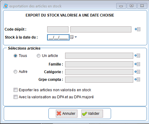 L'option "exporter les articles non valorisés en stock" permet d'inclure ou pas les articles non valorisés en stock dans le fichier généré par l'export. Si ces articles sont inclus, ils seront exportés avec la quantité en stock à la date choisie mais sans valeur ni CMUP ni FIFO.