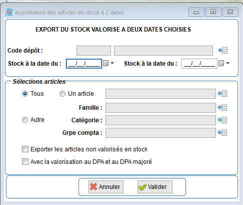 Il existe une 2ème possibilité d'export du stock valorisé, cette fois avec le choix de 2 dates de valorisation. Dans ce cas vous avez l'écran de sélection ci-dessous :