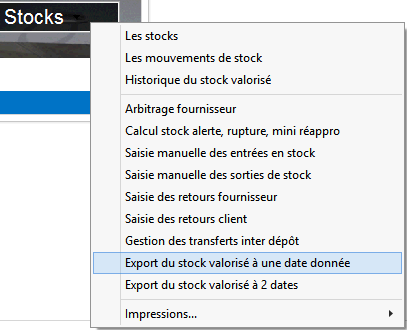 Pour effectuer l'export valorisé de votre stock, accédez au menu contextuel par le clic droit de la souris sur le bouton "stocks" dans le menu graphique et choisissez « Export du stock valorisé à une date donnée » ou bien "Export du stock valorisé à 2 dates" si vous voulez un export contenant le stock à 2 dates différentes, pour comparer le stock à ces 2 dates.