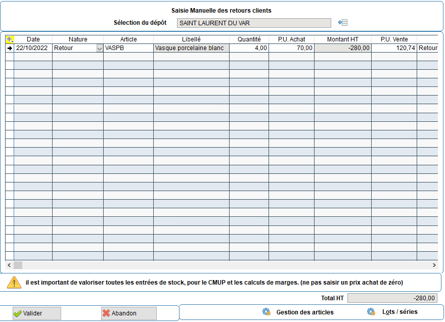 Comme il s'agit de retour de marchandises provenant de clients, la logique voudrait que les lots en retour soient présents dans votre dossier et qu'il y ait une vérification : actuellement ce n'est pas le cas, cette saisie est libre. On considère que cette fonction de retour client est rarement utilisée, le procédé à privilégier est le bon de retour de livraison ou l'avoir à partir d"une facture.