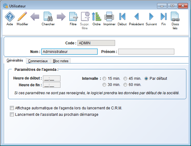 Il est également possible de définir un commercial par défaut à un utilisateur. Dans ce cas, lors du lancement du CRM par l’utilisateur, tous les modules de CRM filtreront par défaut sur ce commercial.