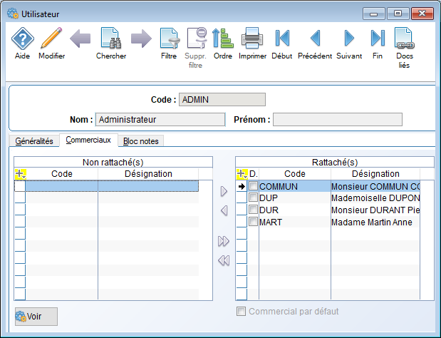 Par défaut, le commercial COMMUN créé lors de l’installation est affecté à chaque utilisateur créé.