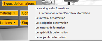 Permet de gérer toutes les informations sur les formations : niveaux, catégories, natures, spécialités, objectifs, catalogue de formations et informations complémentaires formations.