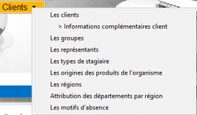 Permet d’accéder aux informations concernant les clients à savoir les représentants, les groupes de clients et le portefeuille de clients. Et les types de stagiaire. Et les origines des produits de la formation, et les motifs d'absence de stagiaires. Il permet aussi de définir les régions et départements, pour intégrer les numéros ROFHYA.