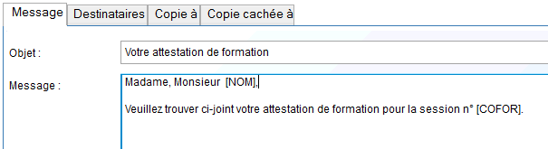 Il s'agit d'un texte constant dans lequel peuvent être incorporés des éléments variables. Ces derniers peuvent être définis en insérant dans le texte des codes courts entre crochets qui seront remplacés lors de l'envoi du mail par leur valeurs réelles.