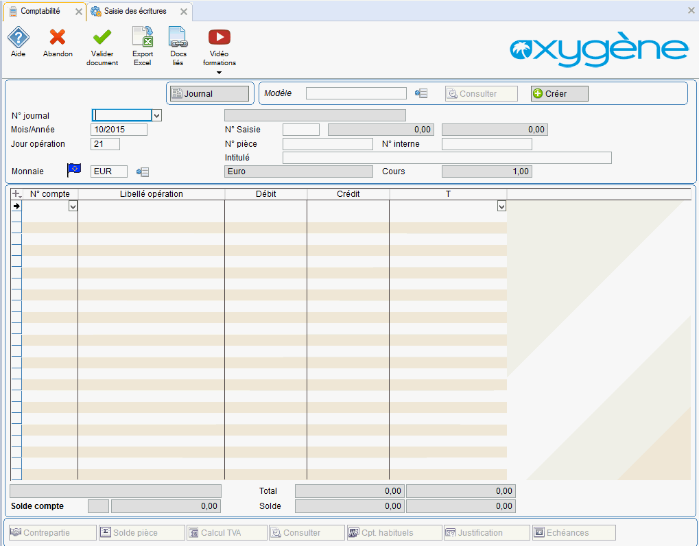 En grisé, vous visualisez le total Débit et le total Crédit de votre pièce ainsi que le solde de la pièce au fur et à mesure de votre saisie. Validez votre saisie.