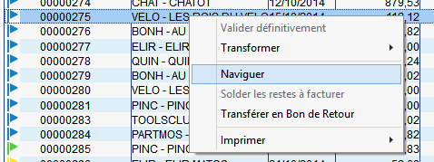 Sur chaque pièce du tableau de bord des devis, commandes, bons de livraison et factures, vous pouvez accéder par le clic droit de la souris au menu contextuel et choisir « Naviguer ».