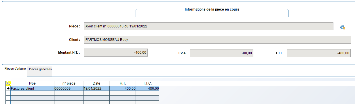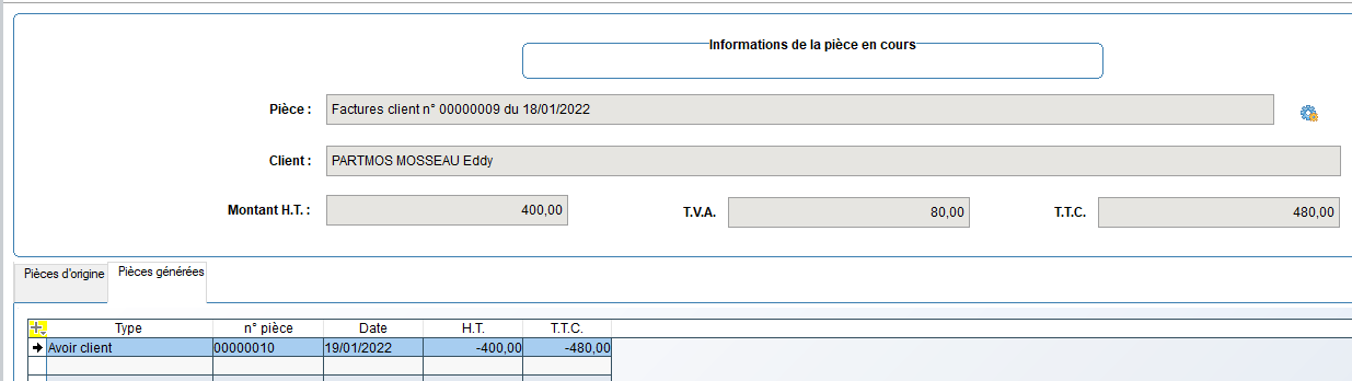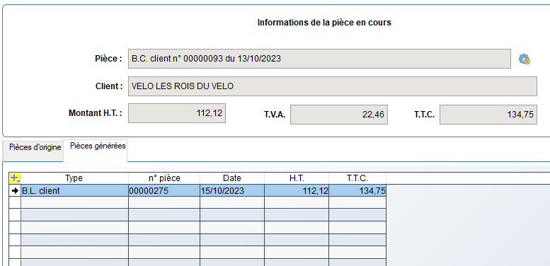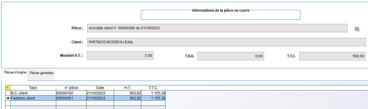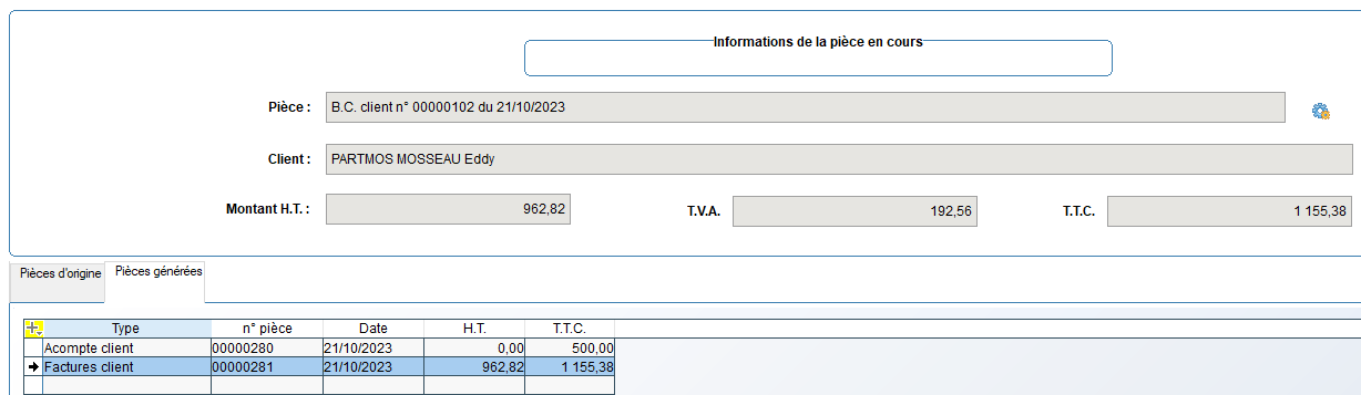 à droite du numéro de la pièce. Le client et les montants HT, TVA et TTC sont affichés pour la pièce en cours.