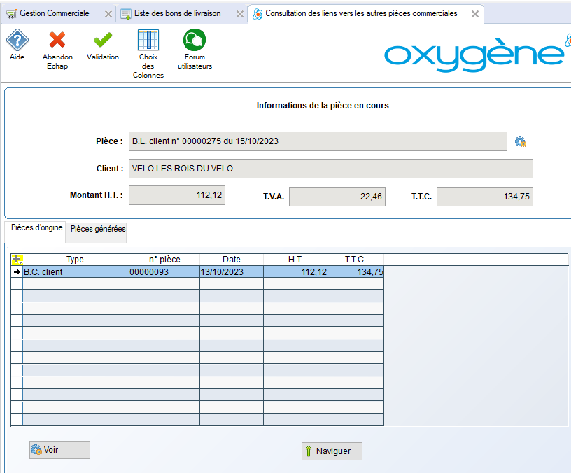 Ainsi, dans les écrans précédents, vous pouvez visualiser l’historique du bon de livraison n° 00000275, provenant de la transformation de la commande n°00000093, et ce BL a généré la facture n° 00000268.