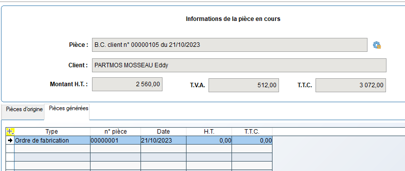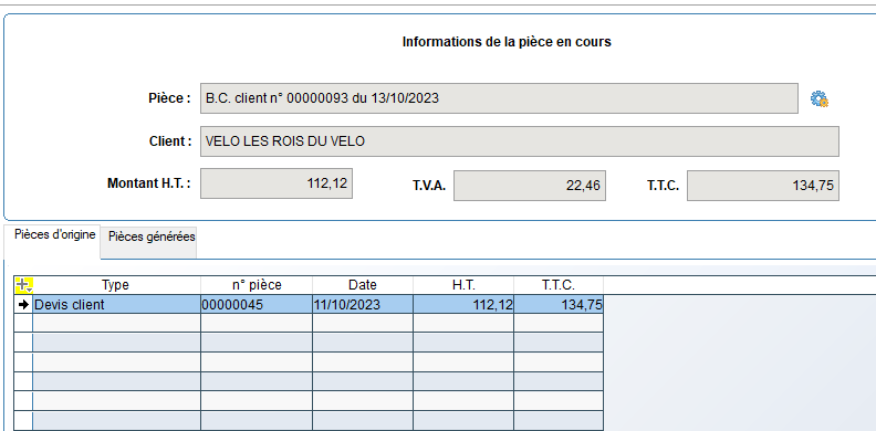 Si on choisit, par exemple, de définir le bon de commande n° 00000093 comme pièce en cours, on obtient alors l’historique de ce bon de commande, c’est-à-dire le devis n° 00000045 comme pièce d’origine et le bon de livraison n° 00000275 en pièce générée :