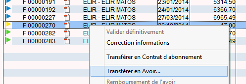 Vous avez la possibilité de transformer une facture directement en avoir quel que soit son état. Il vous suffit simplement de vous positionner sur la facture à transformer en avoir dans la liste du tableau de bord et d’accéder au menu contextuel par le clic droit de la souris.