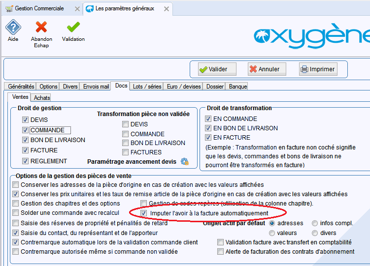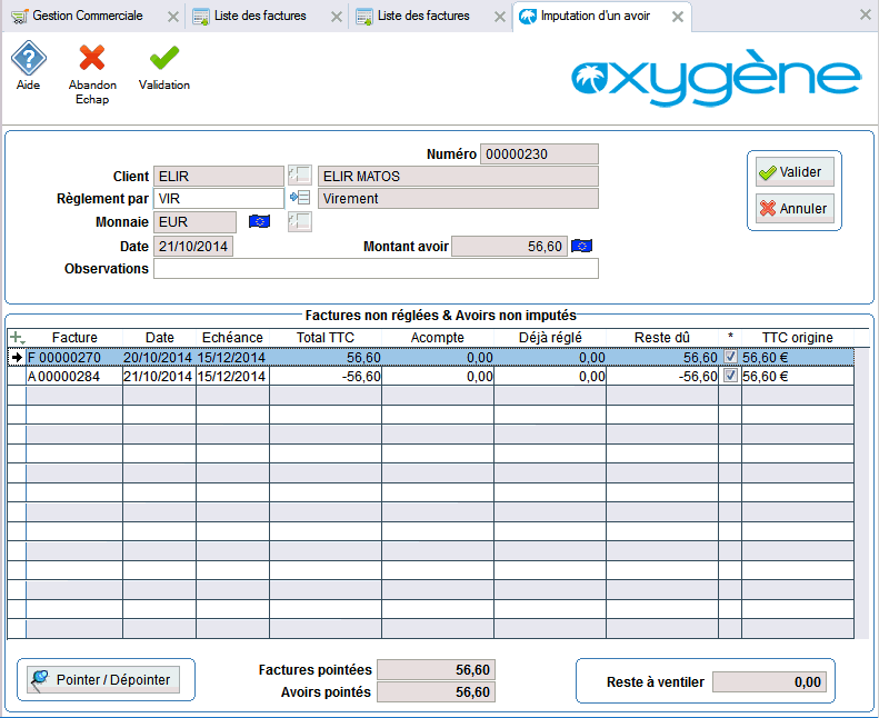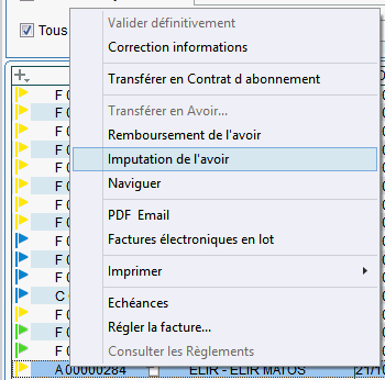 Dans le cas contraire, après validation de la facture et de l'avoir, il faudra choisir "Imputation de l'avoir" par clic-droit sur l'avoir,
