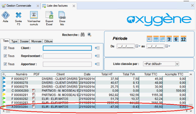 Une fois l’opération effectuée, vous visualisez automatiquement l’avoir généré avant de décider son enregistrement. Vous visualisez ensuite dans le tableau de bord, la facture et l’avoir correspondant.