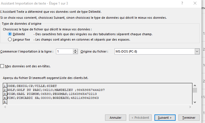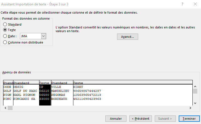 Dans cet écran on doit définir le format de chaque colonne, et c'est ici que l'on peut indiquer par exemple que la colonne code postal et celle du SIRET sont des textes et pas des nombres. Sélectionner une à une chaque colonne et choisir "texte". Par contre ce n'est pas la peine de changer les colonnes "standard" en texte, si le résultat affiché est correct. Ci-dessus on n'a pas modifié la colonne des codes client ni celle des noms.