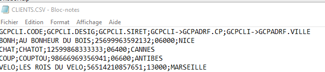 on voit dans le fichier ouvert avec le bloc notes Windows que l'on a les pré zéros sur le code postal, et que les SIRET sont corrects.