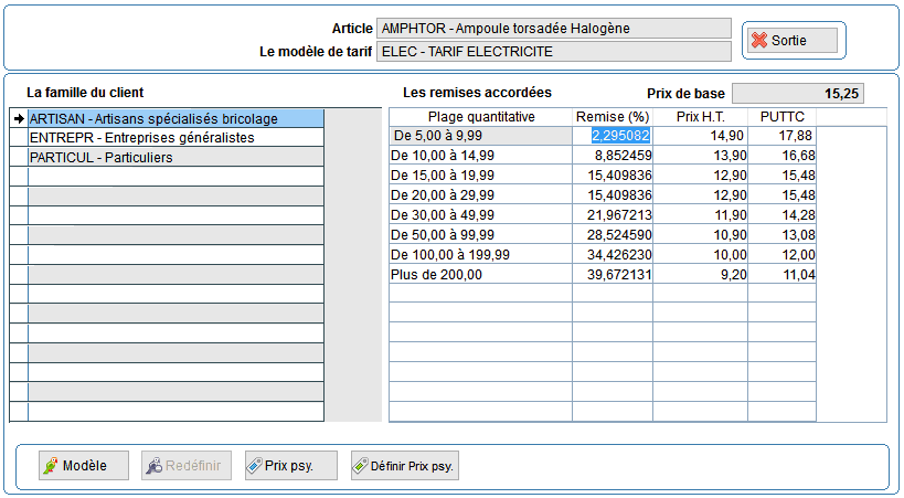 La grille tarifaire qui s’ouvre vous propose pour cet article les différentes remises appliquées par plage comme pré-défini dans le modèle de tarifs appliqué.