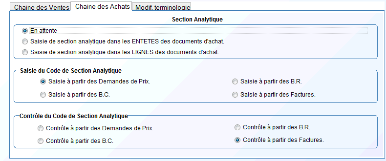 Ce sous onglet permet de définir comment vous souhaitez gérer l'analytique dans les pièces d'achat de la gestion commerciale. Le mode de fonctionnement est le même que celui pour les pièces de vente. (mise en attente, type de pièce pour la saisie et pour le contrôle)