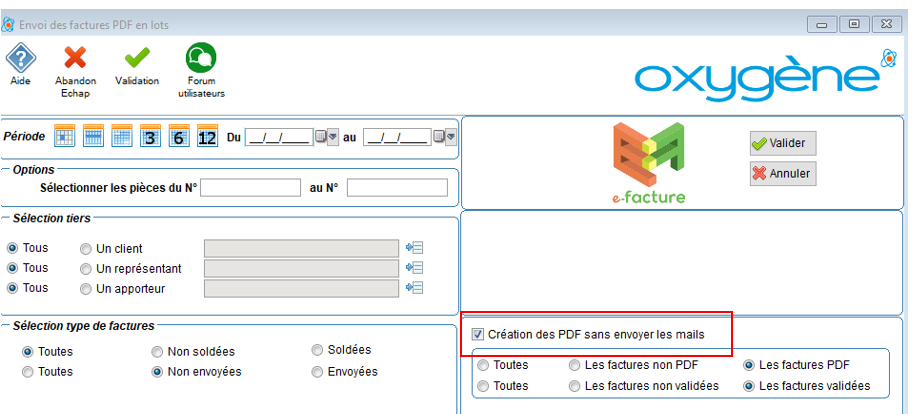 Avec ces 2 cases cochées vous pourrez lancer l'envoi e-facture en lots, avec le bouton