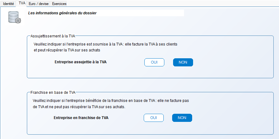 Ces paramètres permettent de déterminer si votre entreprise facture la TVA à ses clients et si elle peut récupérer la TVA sur ses achats. Ils sont obligatoires pour garantir le bon fonctionnement de la facturation et des déclarations.