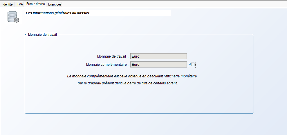 La monnaie de travail est sélectionnable lors de la création du dossier. Elle n'est plus modifiable par la suite.